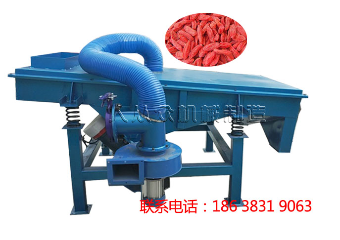 咨詢熱線:18638319063(微信同號(hào)) 枸杞分級(jí)、除雜機(jī)由直線振動(dòng)篩配合適當(dāng)網(wǎng)孔的篩網(wǎng)和風(fēng)機(jī)設(shè)備組成,篩網(wǎng)主要是用于透篩大小適合的物料,而風(fēng)機(jī)主要的作用是吹去枸杞中所含的雜質(zhì)。