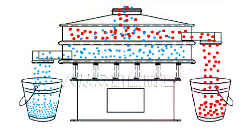 旋振篩采用立式電機作激振源,工作時通過偏心重錘將電機的旋轉(zhuǎn)運動轉(zhuǎn)變?yōu)樗?、垂直、傾斜的三次元運動,這個運動力傳到篩面,從而使篩面上的物料一起運動,伴隨著篩網(wǎng)的運動,小于篩面孔徑的物料通過篩孔落到下層,大于篩面孔徑的物料從排料口排出,完成篩分工作??梢酝ㄟ^調(diào)整偏心塊的位置,來改變物料的運動軌跡,從而適應(yīng)不同的篩分目的。