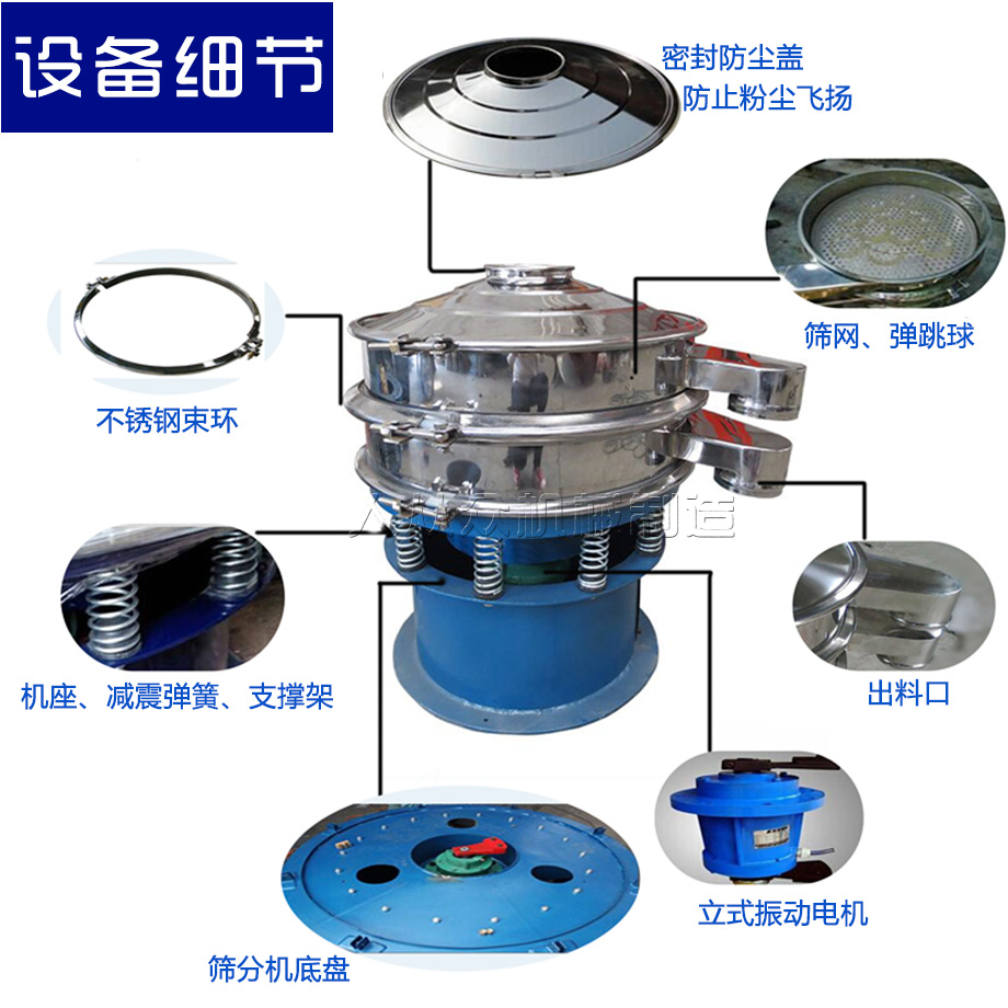 1.旋振篩工作效率高、壽命長、功耗低,可篩分多種粉類、粘液類產(chǎn)品;