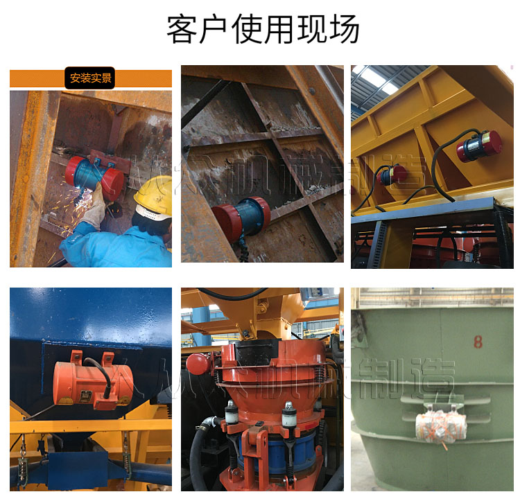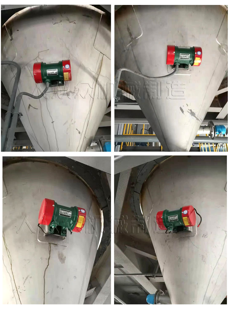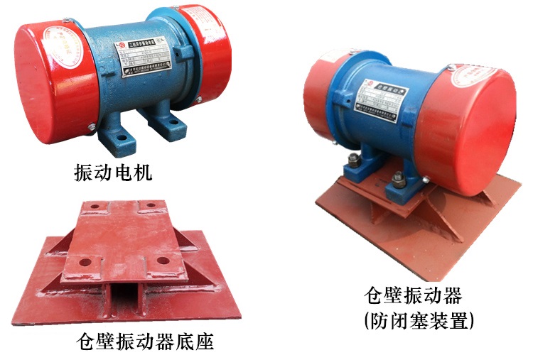 由振動電機、底座兩部分組成。振動電機和底座由螺栓緊密地固定為一體,由于底座堅固地安裝在料倉壁上,這樣就構成了單質點定向振動系統(tǒng)。當防閉塞裝置工作時,振動電機的高速轉動,便產生了對料倉壁的周期性高頻振動,由于防閉塞裝置的周期性振動,一方面使物料與倉壁脫離接觸、消除物料與倉壁的摩擦,另一方面使物料受交變速度和加速度的影響,處于不穩(wěn)定狀態(tài),從而有效地克服物料的內摩擦力和聚集力,以消除料倉內物料間的相對穩(wěn)定性,使物料從料倉口順利排出。